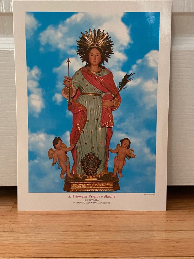 Most of you know that I have a special devotion to St. Philomena. I purchased this sacramental on one of my first trips to Italy. I have personalized and signed the back. You can bid on it now on eBay.